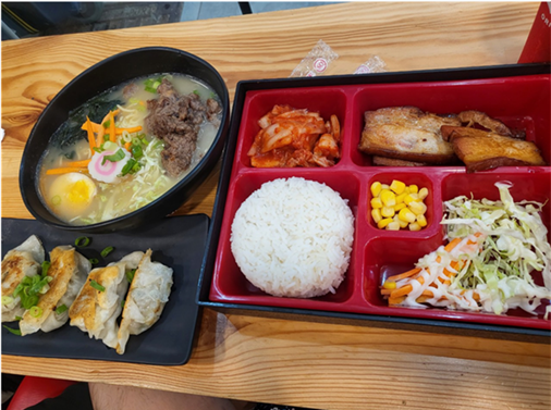 점심으로는 일본 매운 소고기 라멘(Spicy Beef Ramen)과 차슈 도시락 (Char Siu Bento)를 먹었어요.