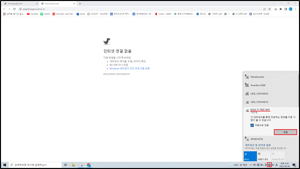 네트워크 및 인터넷 설정 -> MCIA T1 FREE WIFI 연결