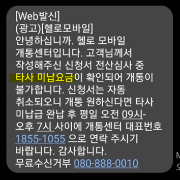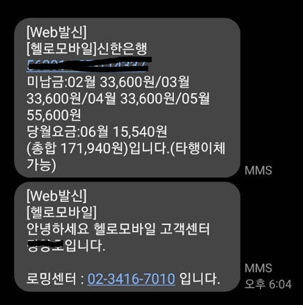 타사 미납 요금이라고 문자가 왔지만 헬로 모바일 미납 요금입니다.. 왜 저렇게 보냈는지 알 수 없습니다