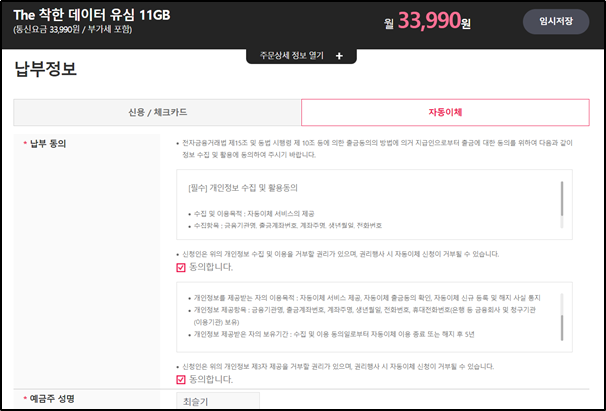 저는 통장에서 자동이체 되게끔 ☑ 자동이체를 선택했습니다.