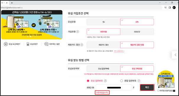 다음에는 8982 06 뒤에 있는 USIM 일련 번호를 입력하시고 인증 확인을 누르시면 올바르게 입력했을 경우 인증되었습니라고 뜹니다.