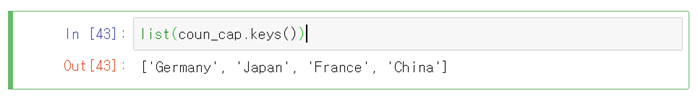 | keys() | Docstring: D.keys() -> a set-like object providing a view on D's keys | 키 전체를 리스트형식으로 정렬 | coun_cap.keys() dict_keys(['Germany', 'Japan', 'France']) |