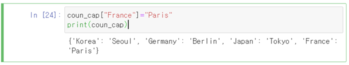 딕셔너리1에 딕셔너리2추가 | coun_cap2={"China":"Bazing"} coun_cap2 {'China': 'Bazing'} coun_cap.update(coun_cap2) print(coun_cap) {'Germany': 'Berlin', 'Japan': 'Tokyo', 'France': 'Paris', 'China': 'Bazing'} |