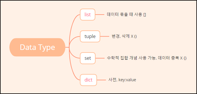 | dict | 사전처럼, key와 value값으로 되어있고 키를 사용해서 값으르 다룬다. | {} | key:value, | 추가 및 변경 dict[key]=value 삭제 del dict[key] |