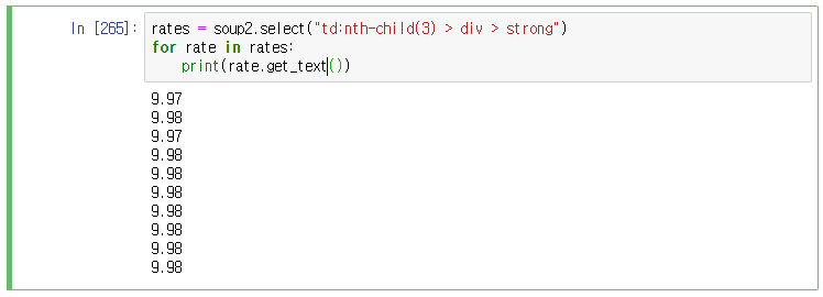 rates = soup2.select("td:nth-child(3) > div > strong")
