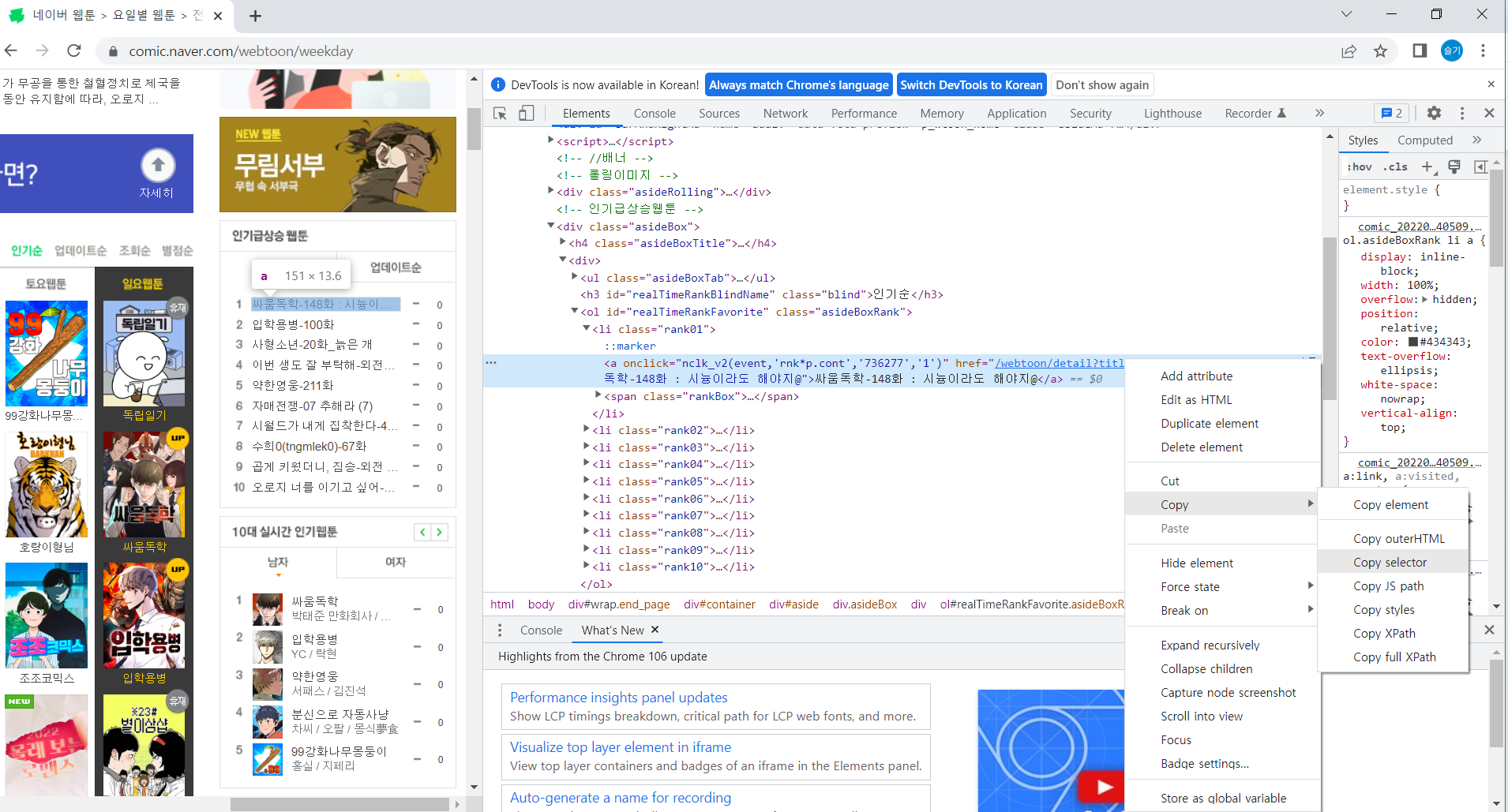 인기 급상승 웹툰을 가져오기 위하여 먼저 웹툰 제목을 선택합니다.