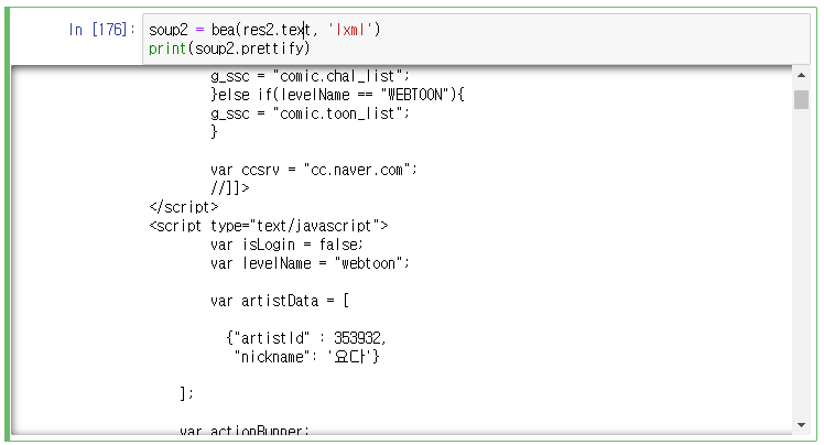 BeautifulSoup을 이용하여 원하는 값을 추출하기 위하여 아래와 같이 선언해보았다.