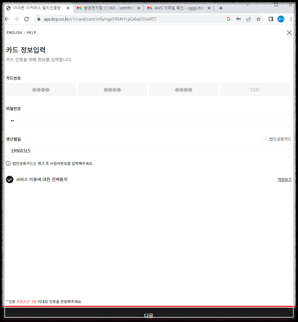 잠시 후 핸드폰으로 인증코드가 전송되면 코드를 입력하시면 됩니다.