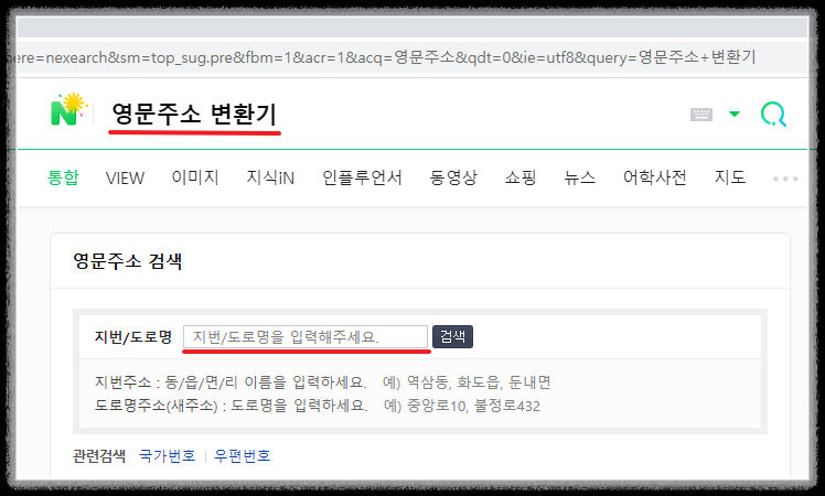 주소는 Naver에 영문주소 변환기로 본인의 주소를 입력해주세요(아래참고)