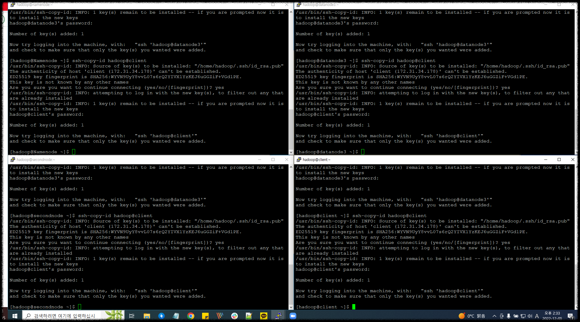 키가 잘 복사됐으면 각각의 모든 서버를 비밀번호 없이 들어갈 수 있다.