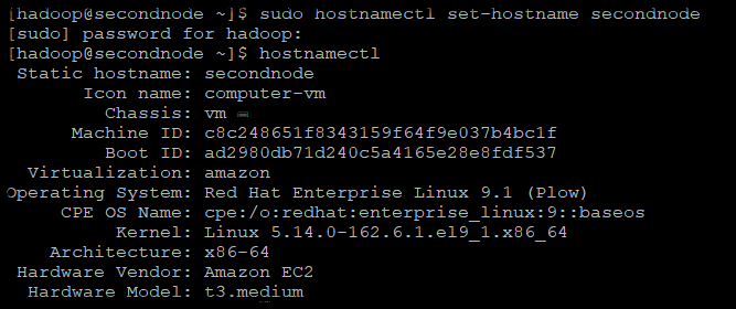 [hadoop@secondnode ~]$ sudo hostnamectl set-hostname secondnode