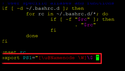 서버 4대를 동시에 다루다 보니 가끔 어떤 서버가 NameNode 서버였는지 DataNode 서버였는지 잊어버리기 때문에, 프롬프트를 변경해준다.