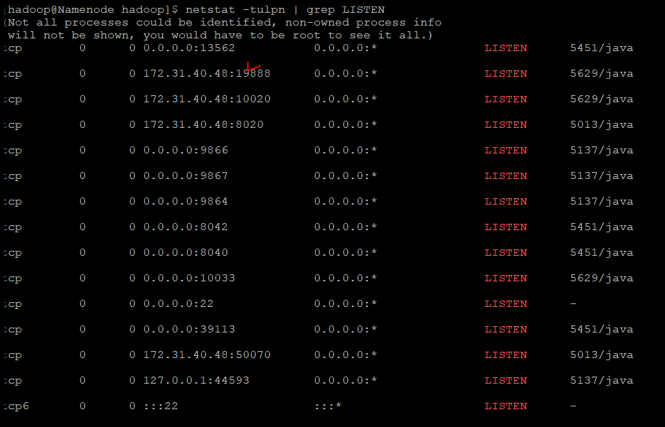 tcp 0 0 172.31.40.48:19888 0.0.0.0:* LISTEN 5629/java