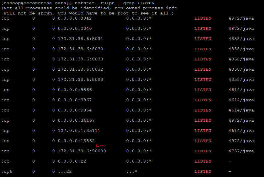 tcp 0 0 172.31.38.6:50090 0.0.0.0:* LISTEN 4737/java