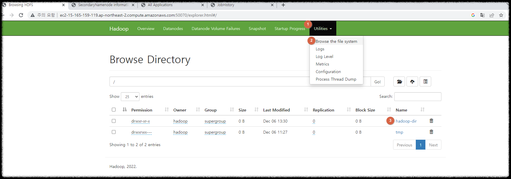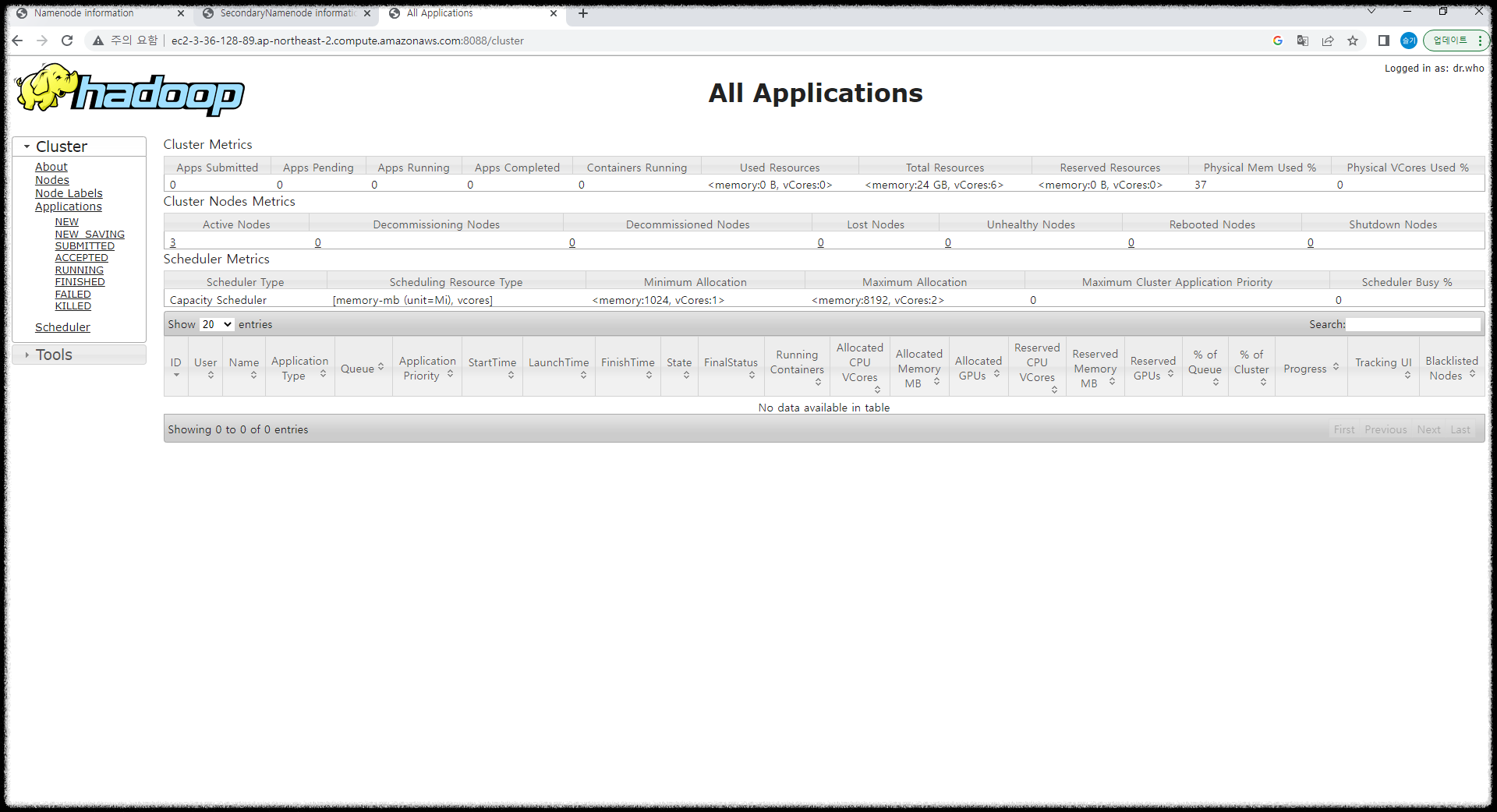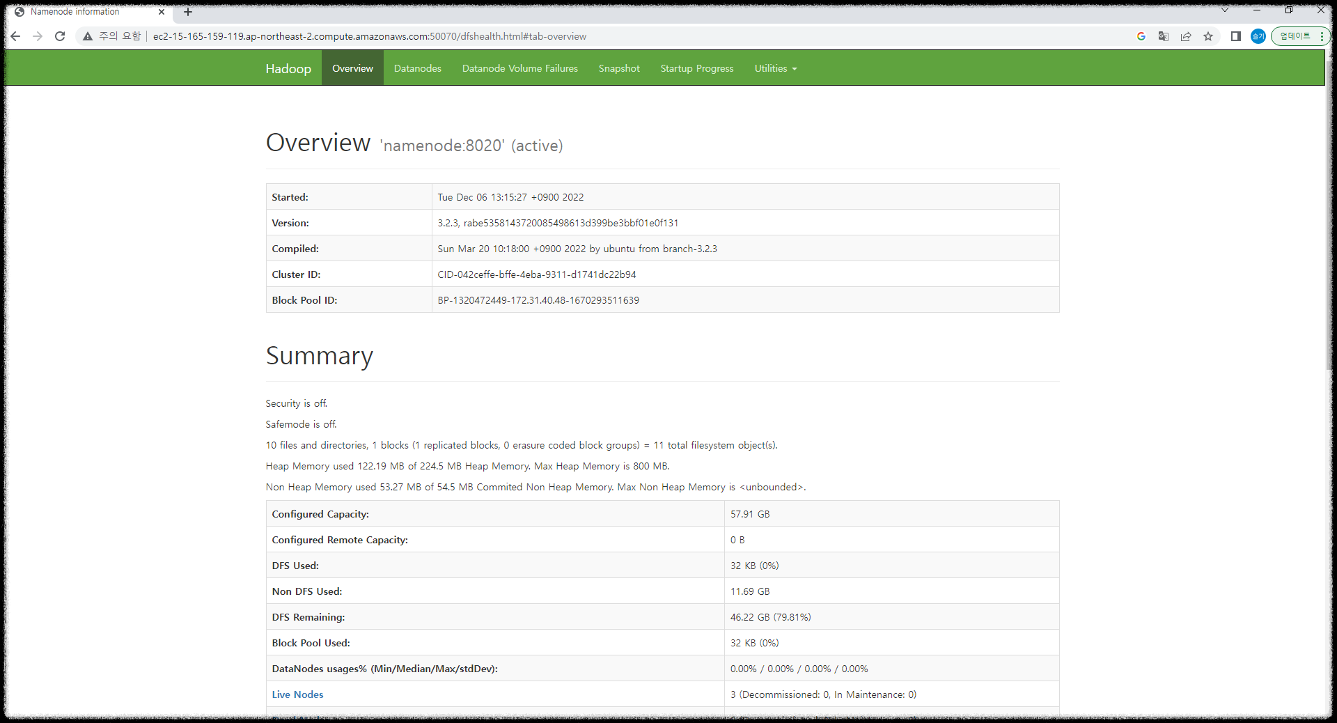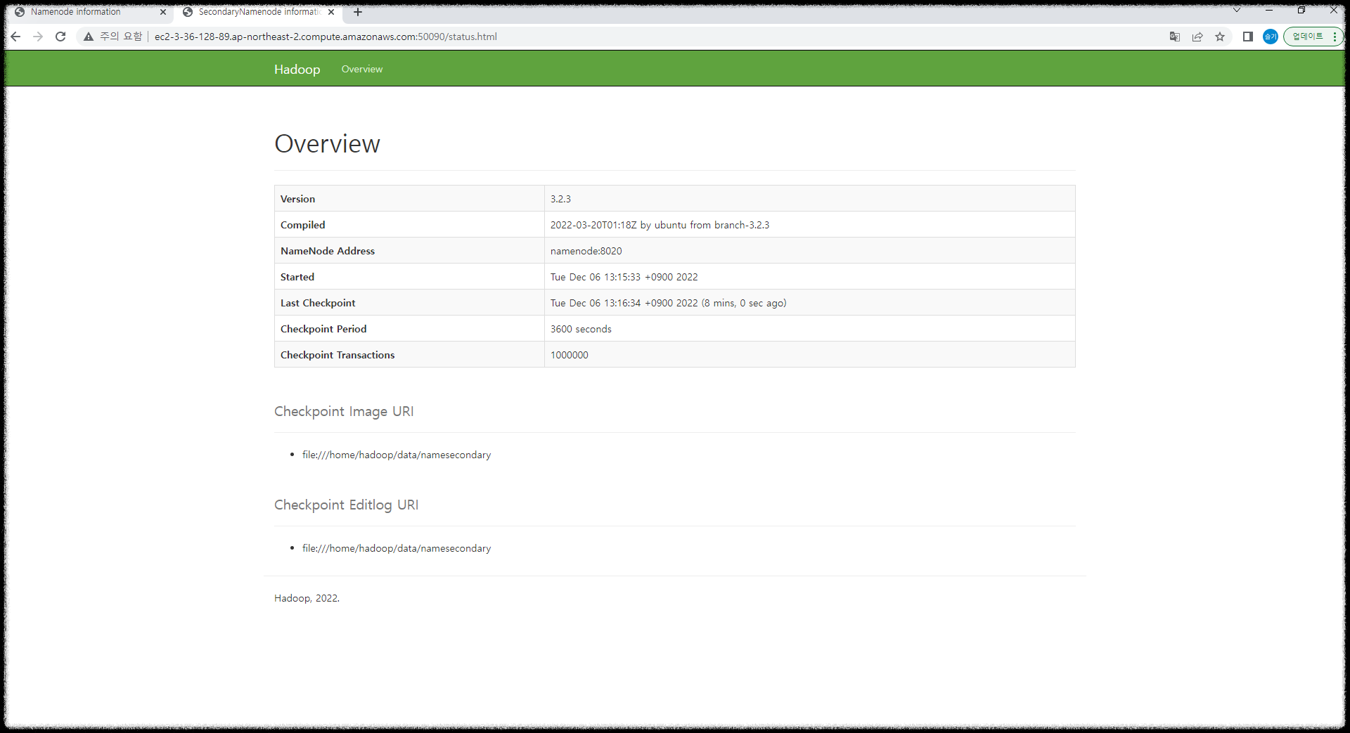 - SecondaryNode그리고Resource Manager DNS : ec2-3-36-128-89.ap-northeast-2.compute.amazonaws.com