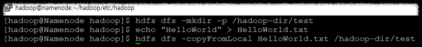 [hadoop@Namenode hadoop]$ hdfs dfs -copyFromLocal HelloWorld.txt /hadoop-dir/test