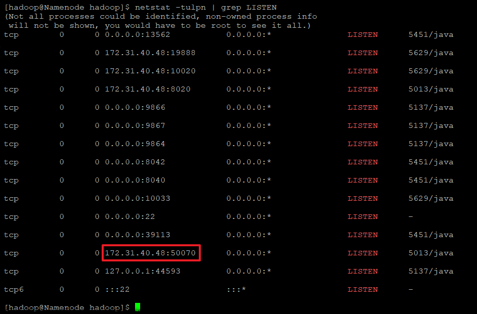 tcp 0 0 172.31.40.48:50070 0.0.0.0:* LISTEN 5013/java