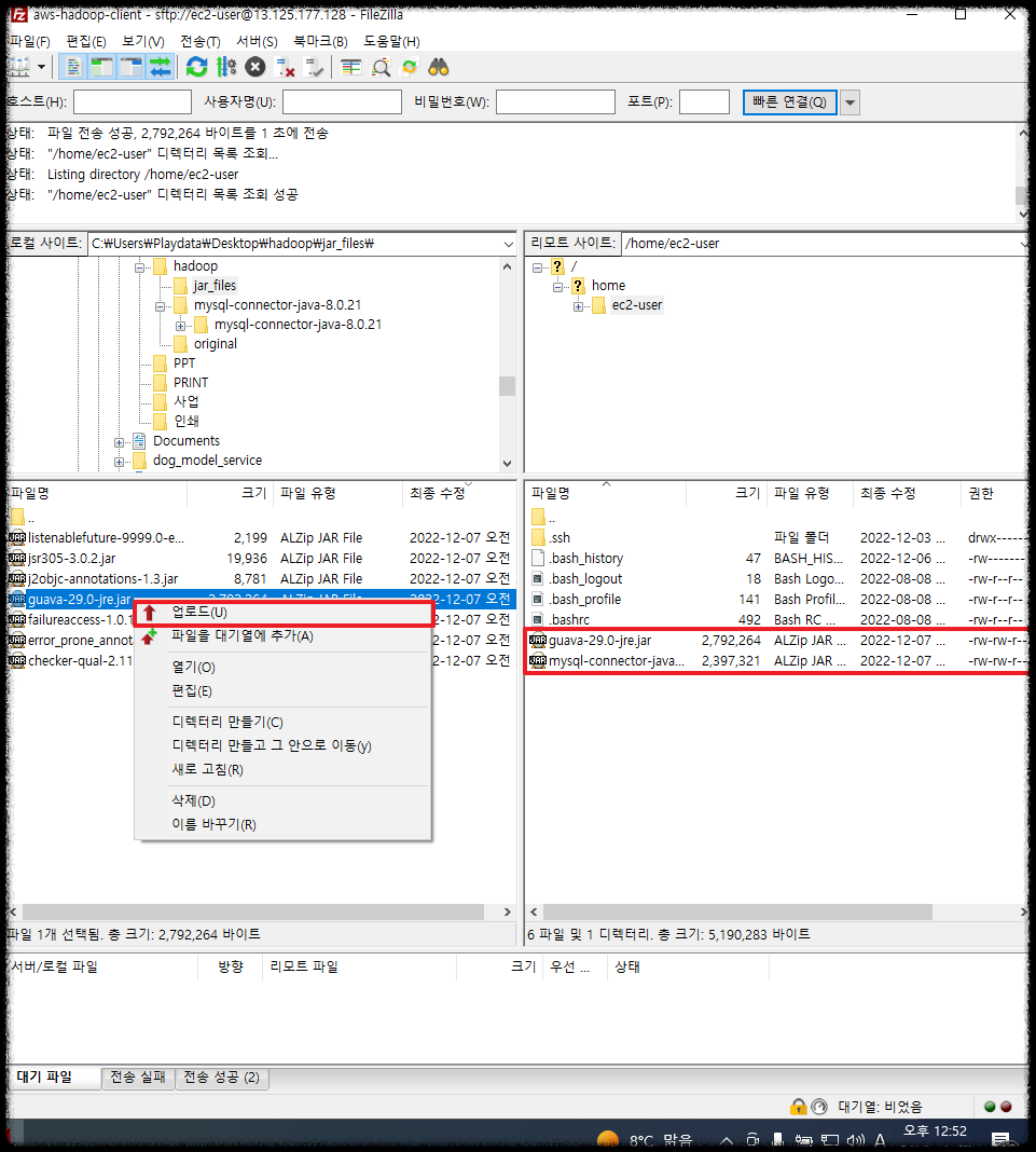잠시 후 File Zilla라는 FTP 프로그램을 이용해서 mysql-connector-java-8.0.21.jar 를 Linux에 업로드합니다.