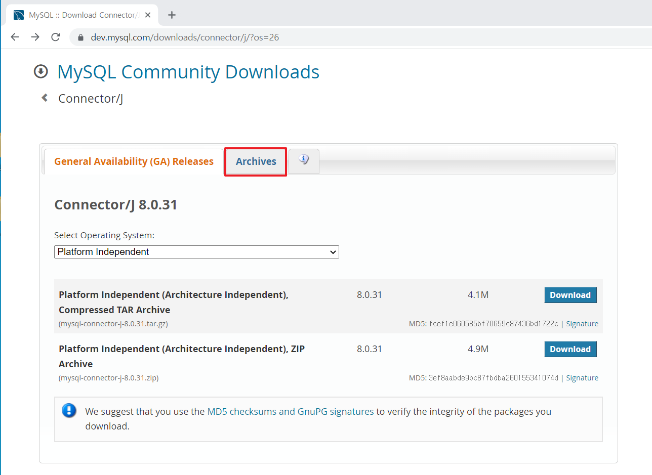 https://dev.mysql.com/downloads/connector/j/?os=26 접속