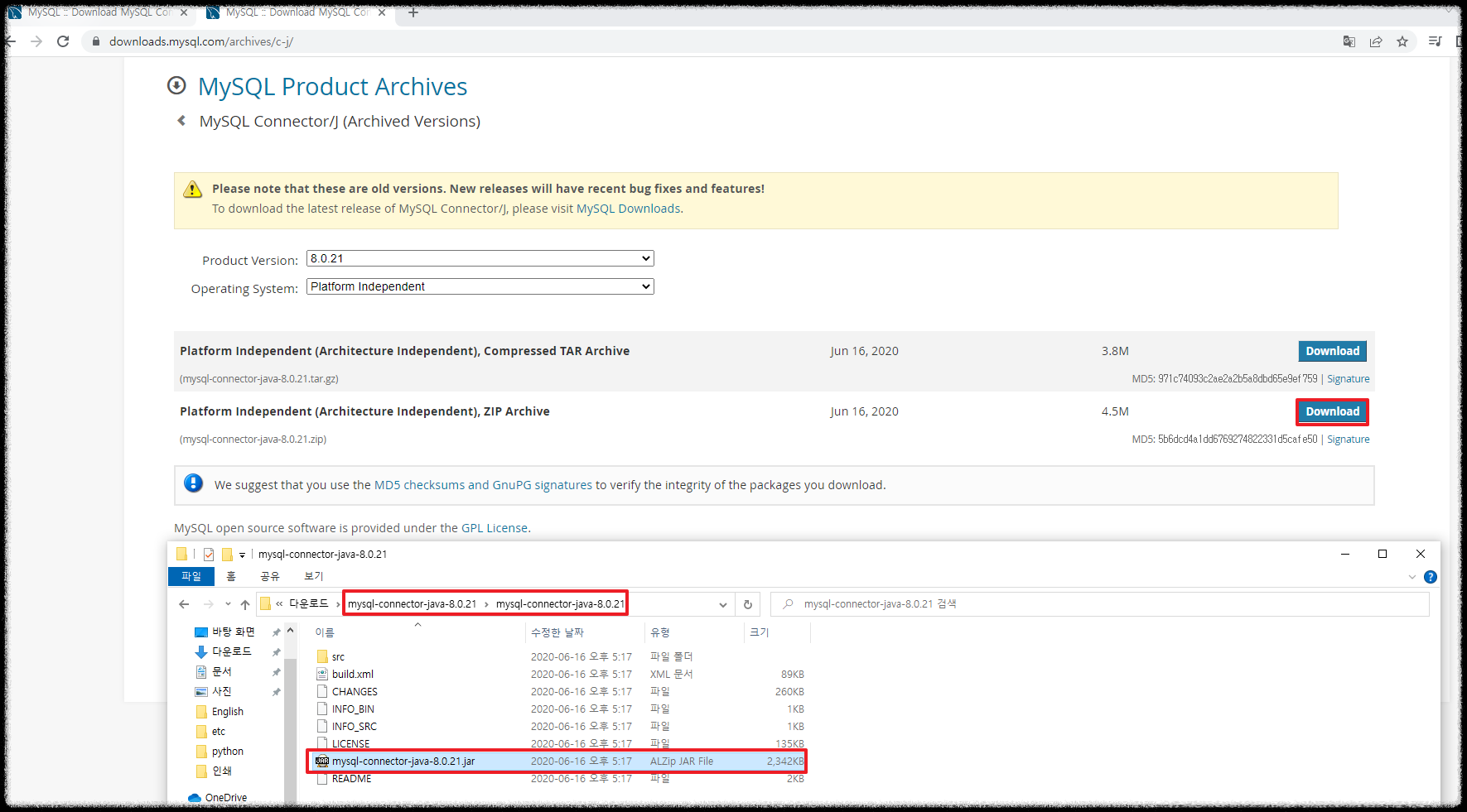 Download -> mysql-connector-java-8.0.21 압축 해제 -> mysql-connector-java-8.0.21.jar 사용
