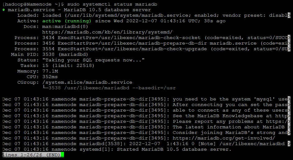 [hadoop@Namenode ~]$ sudo systemctl status mariadb