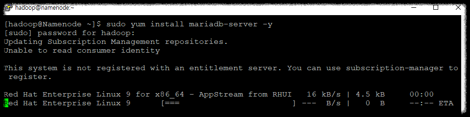 [hadoop@Namenode ~]$ sudo yum install mariadb-server -y