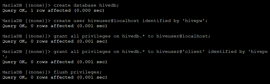 MariaDB [(none)]> grant all privileges on hivedb.* to hiveuser@'client' identified by 'hivepw';
