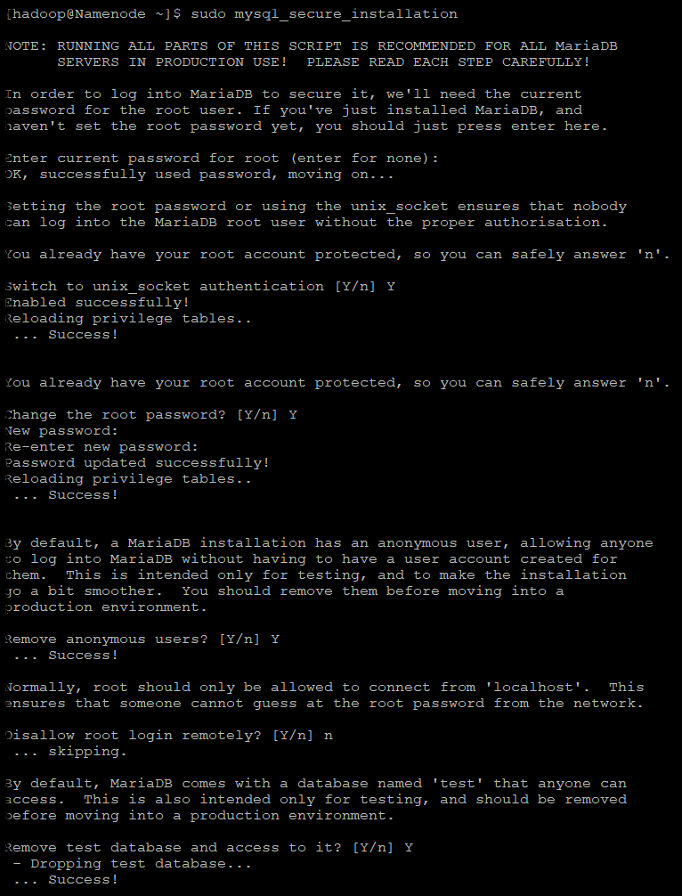 [hadoop@Namenode ~]$ sudo mysql_secure_installation