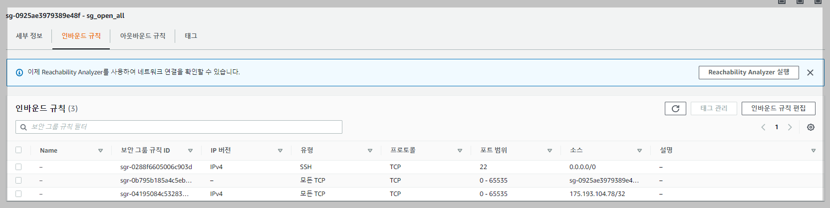 AWS 생성시 본인 IP대역대에 한해서 모든 TCP를 허용한다. 또한 보안그룹끼리의 모든 TCP를 허용한다.