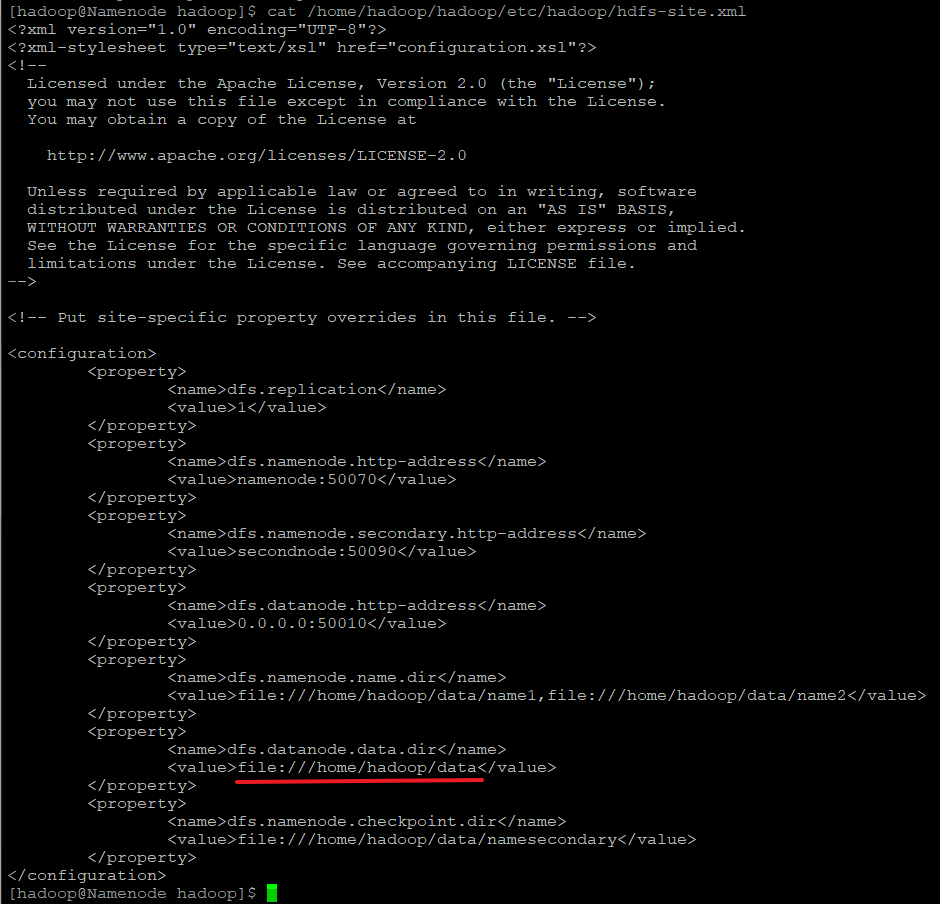 [hadoop@Namenode hadoop]$ cat /home/hadoop/hadoop/etc/hadoop/hdfs-site.xml