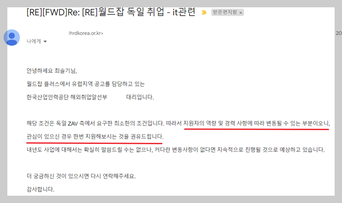 정리하면 학사 학위를 취득하고 3년 경력이 될쯤에 급하게 OPIC 시험을 보고 Resume와 Cover Letter를 작성하고 World JOB 사이트를 통해 ZAV와 독일 회사 이렇게 2곳에 지원하게 되었습니다. (ZAV는 독일의 해외 고용 및 전문가 센터입니다. 외국인의 요구에 맞춘 독일 연방 고용 기관의 부서입니다. 쉽게이야기하면 해외인재를 고용하는 독일 연방 고용 기관 부서입니다.)