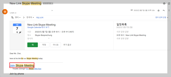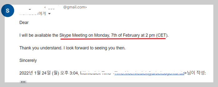 저는 아래와 같이 2월 7일 오후 2시 (CET)기준으로 가능하다고 다시 시간을 제시하여 보냈습니다.