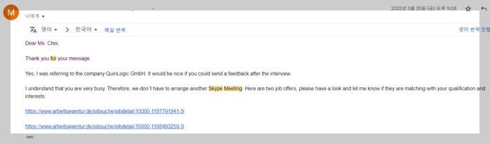 이 글이 보는 사람이 많아지면 독일 헤드헌터와의 면접 내용을 해석하여 상세하게 올리도록 하겠습니다 ㅎㅎ!