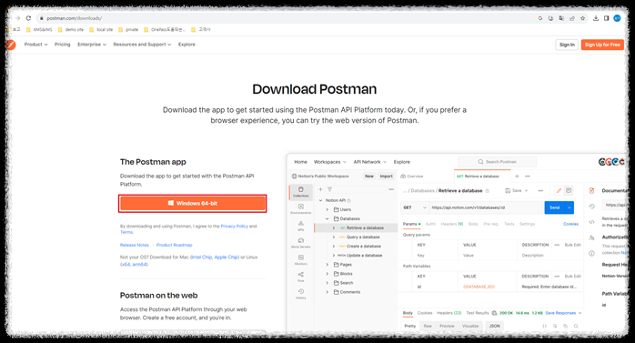 https://www.postman.com/downloads/ -> Windows 64 bit 클릭