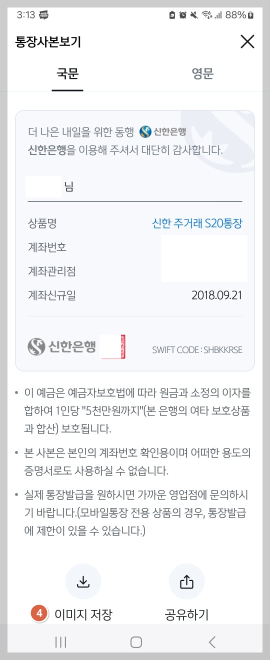이름, 계좌번호가 보이는 통장 첫 페이지를 스캔해주세요. 저같은경우에는 종이로된 통장이 없어서 신한은행 어플에 들어가 "통장사본" 보기를 선택하여 "이미지 저장"을 선택하여 제출하였습니다.