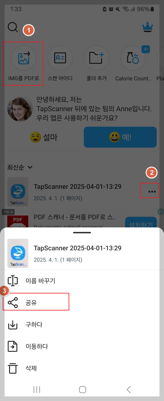 4. 만들어진 PDF 오른쪽에 " ... " 를 선택하여 공유하면 됩니다.
