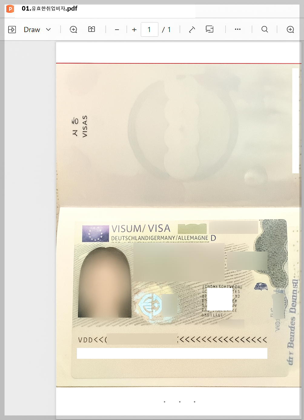 집에 스캐너가 없어 핸드폰 카메라로 취업비자를 촬영한 후,