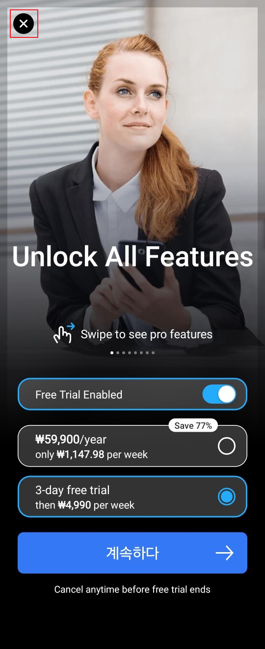 2. 저는 돈을 내지 않고 무료 버전만 사용할 것이기 때문에, X를 선택합니다.