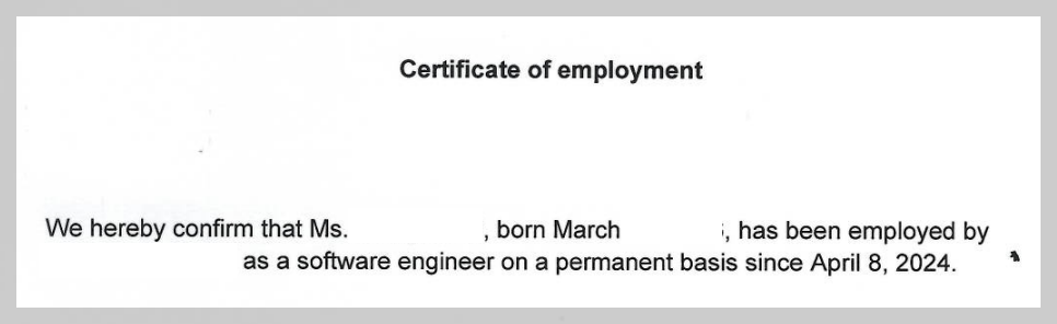 제 재직증명서에는 다음 내용이 포함되어 있었습니다: