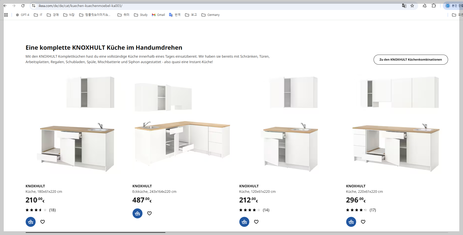 - IKEA는 부엌 가구를 합리적인 가격에 제공하며, Küche24는 부엌 설치를 전문으로 하는 온라인 쇼핑몰입니다.