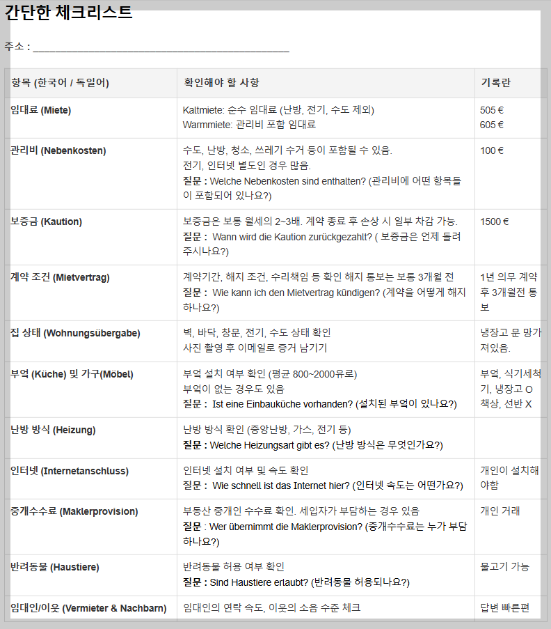 | 임대인/이웃 (Vermieter & Nachbarn) | 임대인의 연락 속도, 이웃의 소음 수준 체크 | 답변 빠른편 |