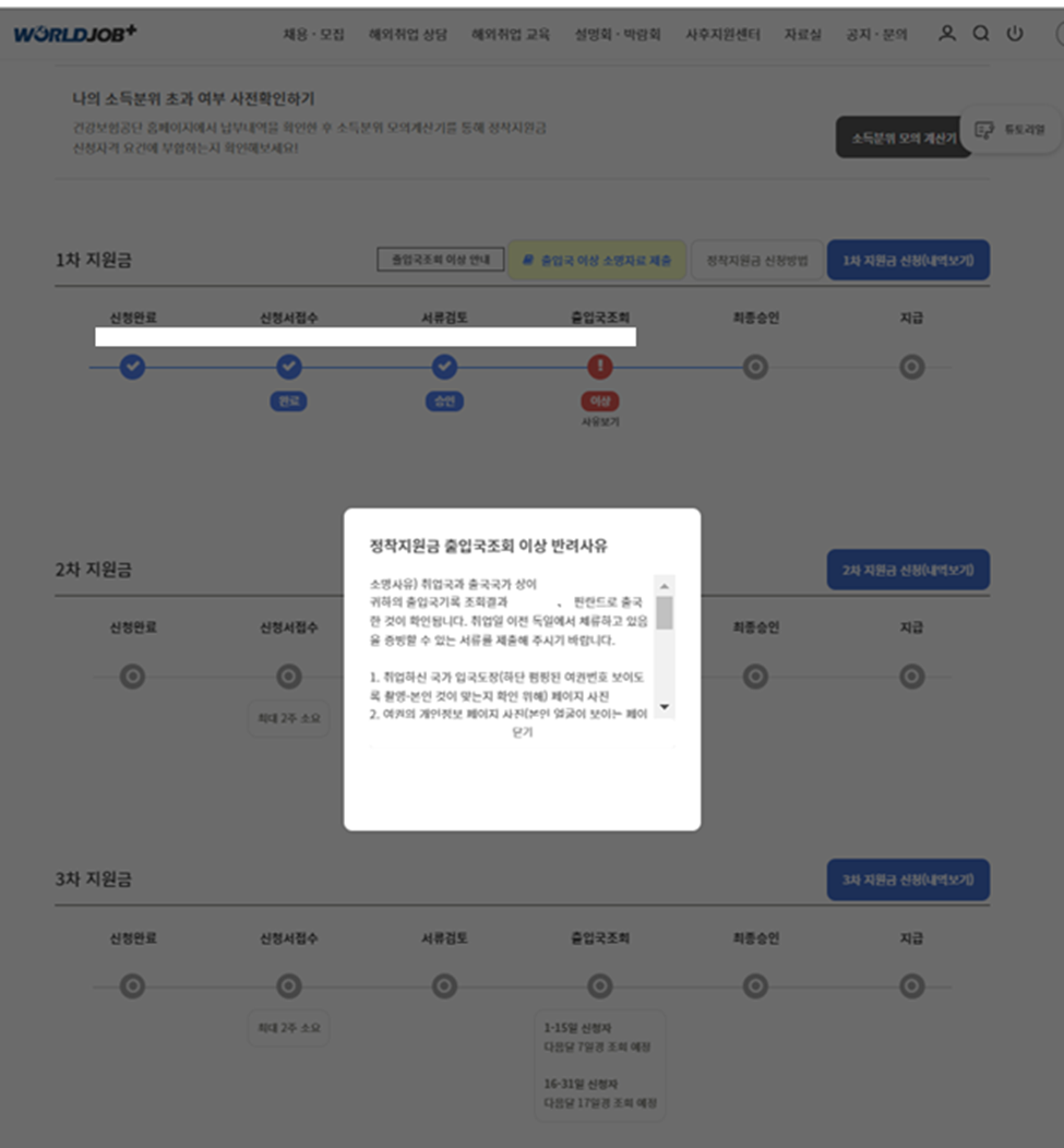 해외취업 후 월드잡을 통해 정착지원금을 신청하다 보면 예상치 못하게 ‘출입국기록 이상’이나 ‘소명자료 미비’ 등의 사유로 1차 신청이 반려되는 경우가 자주 발생합니다.
