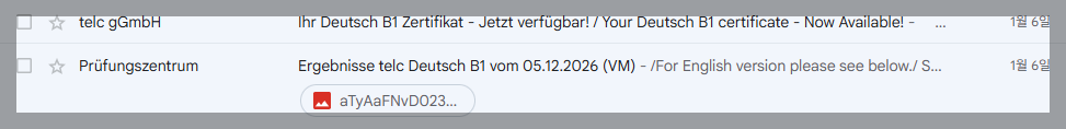 그 상태에서 한 달 집중 공부 후, 2026년 1월, Ausreichend로 TELC Deutsch B1 합격 통지를 받았다.