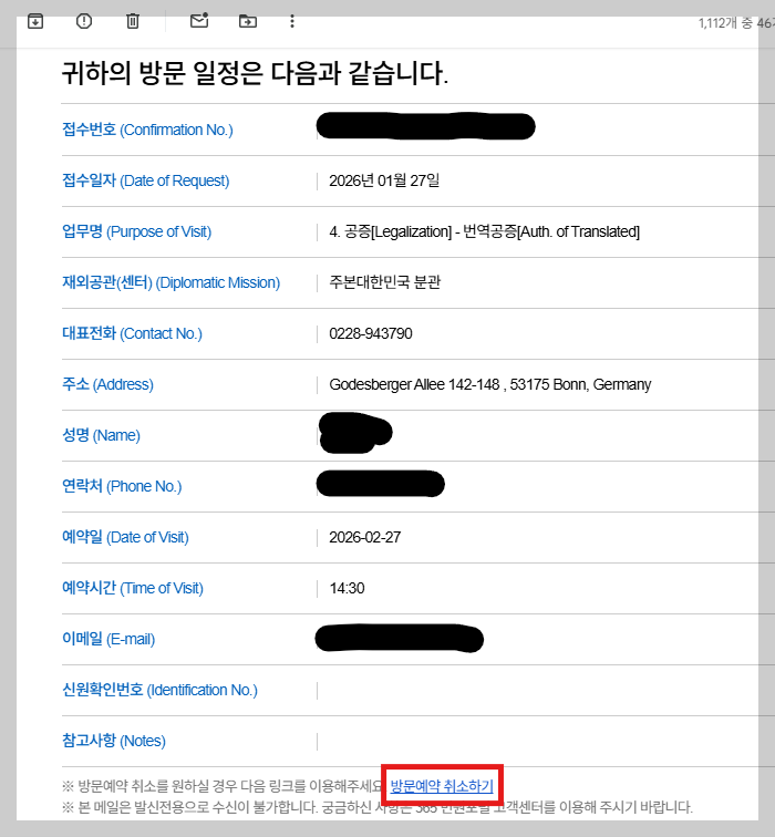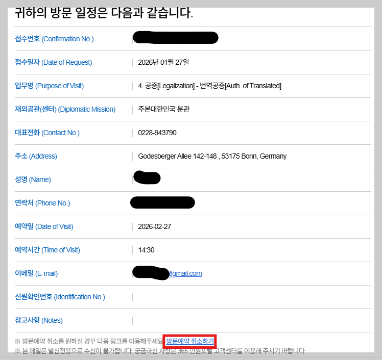 - 메일 하단의 [방문예약 취소하기] 링크 클릭