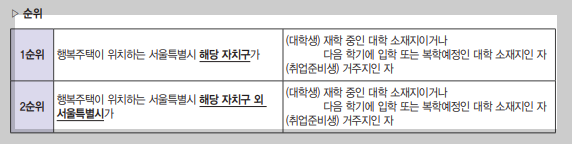 좀 더 자세히 살펴보면 우선 우선 공급은 어떤 계층(대학생/신혼부부 등)이든 거주지 혹은 직장 또는 학교가 행복주택에 위치하고 있으면 우선 공급 지원자격에 해당됩니다.