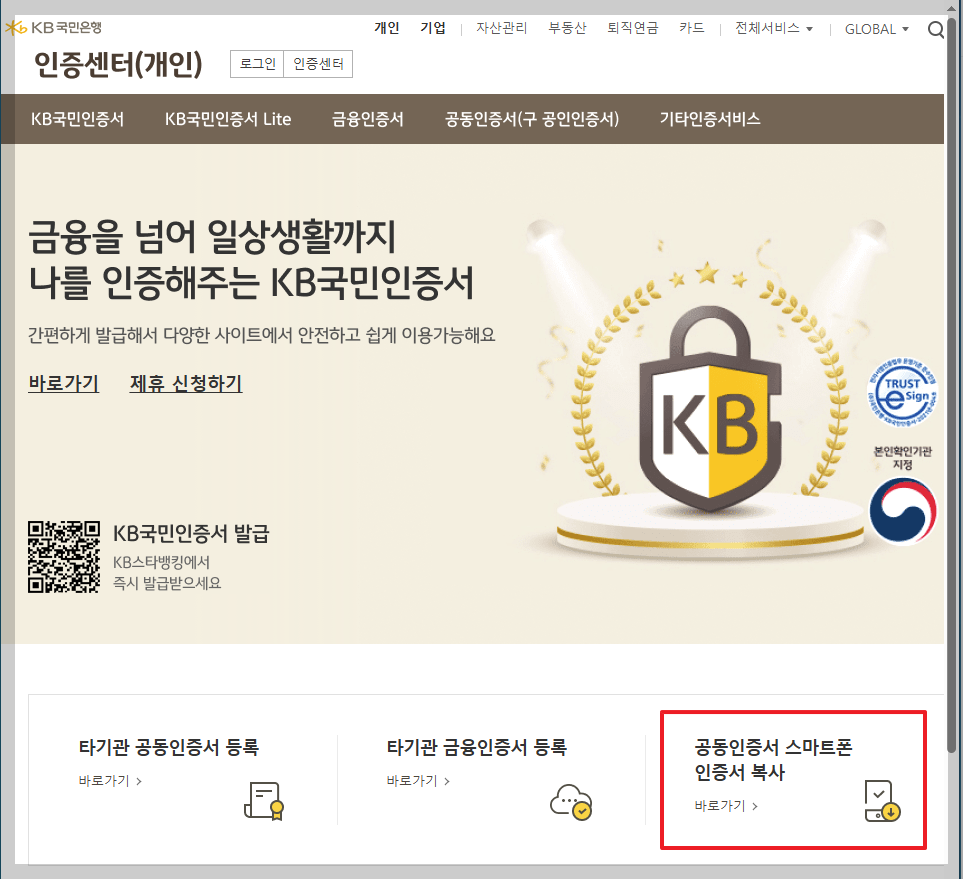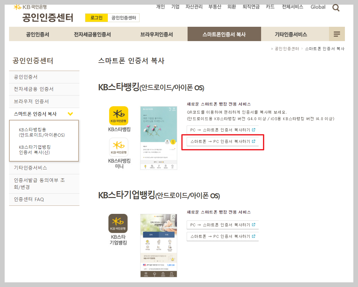 저는 스마트폰에서 PC의 이동식디스크로 인증서를 복사할 것이기 때문에 KB스타뱅킹 인증서 복사를 누릅니다.