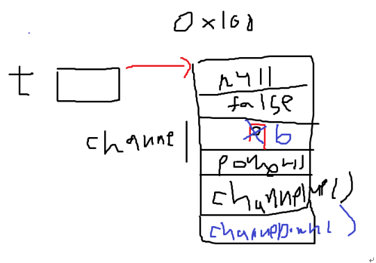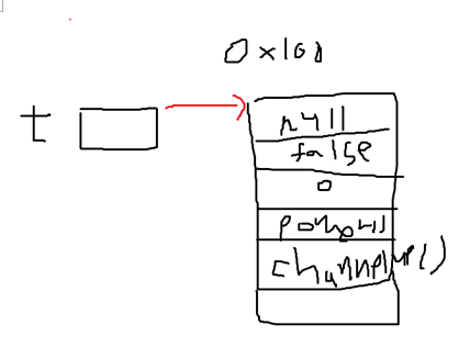 Tv 클래스 타입의 참조변수 t를 선언한다. 메모리에 참조변수 t를 위한 공간이 마련된다. 아직 인스턴스가 생성되지 않았으므로 참조변수로 아무것도 할 수 없다.