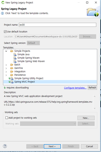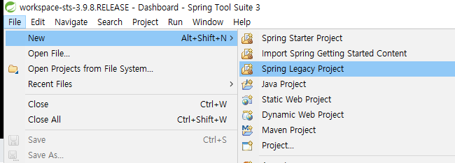 최신 버전인 STS4는 Spring legacy project가 없기 때문에 STS 3.9.8로 다시 설치하기