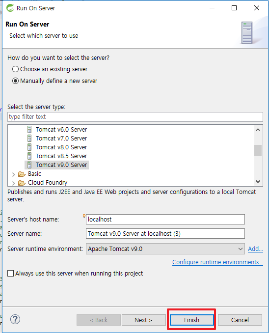 Add 버튼 누르고 Apache Tomcat 9.0을 찾아서 선택, Next를 이용해 압축이 풀려있는 폴더 지정하기