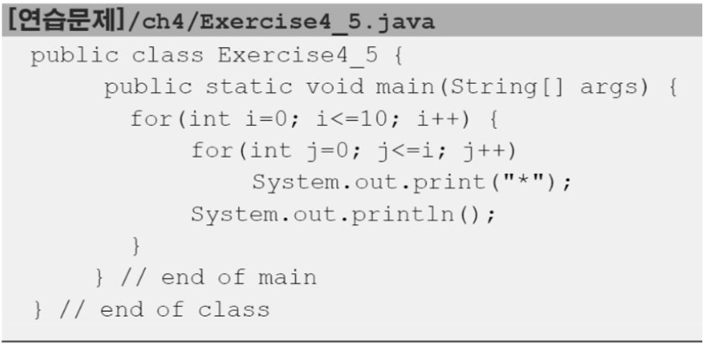 | private static void test4_5() { for (int i = 0; i <= 10; i++) { for (int j = 0; j <= i; j++) System.out.println("*"); System.out.println(); } } |